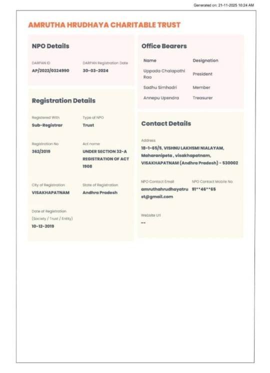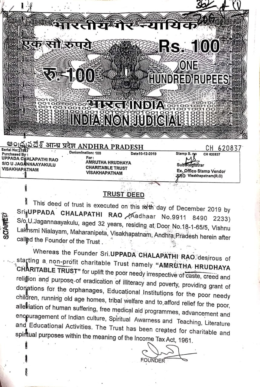 Our organization is led by a visionary leader, Sri. UPPADA CHALAPATHI RAO, whose unwavering commitment to our cause has been the driving force behind our success. Established in 2025, since then the organization has been expanding continuously in terms of social and Educational Development and Medical services, Food, and Sheltering for Orphans. It has worked for the promotion of sustainable, equitable, and participatory development, social welfare, and social justice through Programs for social work, the Establishment of Educational Technical and Medical Institutes supportive relief and education to the people, Health services, and other human service through social research and dissemination of socially relevant knowledge, social intervention through training and field action, contribution to social and welfare policy and program at State, National and International levels, over the years, The organization has among others (NGOs, Trusts) thrusts made A significant contribution to planning, action strategies, and Human Resource Development in several areas, ranging from sustainable rural and urban development to education, health, Agriculture, and Human Rights, in all case, the focus has been on the disadvantaged and marginalized section of societies, such as women, children and tribal. At AMRUTHA HRUDHAYA CHARITABLE TRUST , we envision a world where education is a fundamental right for all. Since our inception in 2025, we have been dedicated to breaking down barriers to education, especially for marginalized and disadvantaged communities. Through our school-building initiatives, scholarship programs, and teacher training, we are working towards creating a brighter future for children and youth, empowering them with the knowledge and skills they need to succeed.